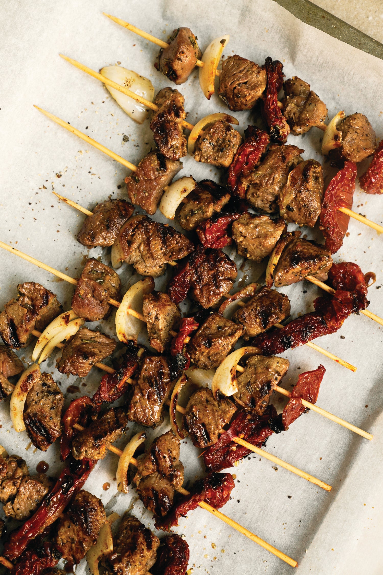 - Reserva la marinada y coloca cuatro pedazos de carne, tres tomates y tres trocitos de cebolla en cada palito de bambú. Sazónalos con mucha pimienta.